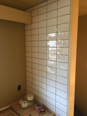 洗面所のタイル張り。施主様が、細かい所まで丁寧に施工しています。 プロ顔負けの仕 Read More