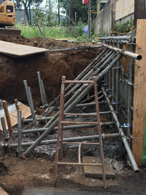 ベニヤで仮押さえをした後に、 型枠を組み、コンクリートを打設しました。 これで安