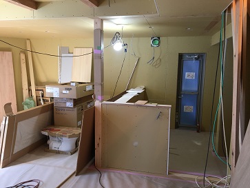 上:システムキッチンの設置。 下:ヒバの無垢材で仕上げた階段。