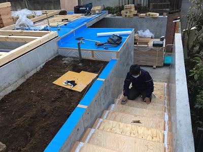 コンクリート打設が終わり、階段および玄関ポーチが完成しました。 しっかりと養生を
