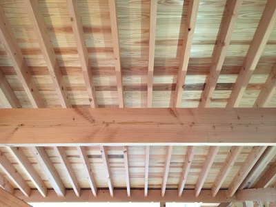 天井が化粧垂木となっているため、垂木が室内側に見えてくる仕上がりです。 杉板の天 Read More