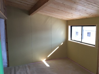 壁は、珪藻土の左官仕上げになるため、 下地となる石膏ボードを張っていきます。
