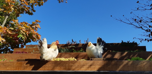 大きな音をたててトラックが通ったのでしょう。 チャボたちが驚いて屋根に飛び乗って
