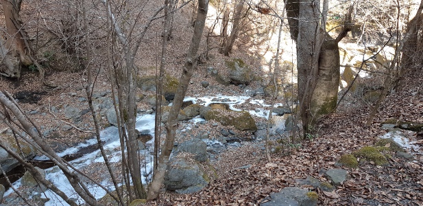 傍を流れる川は所々凍っていて、対岸の斜面は氷のカーテンのようになっていました。
