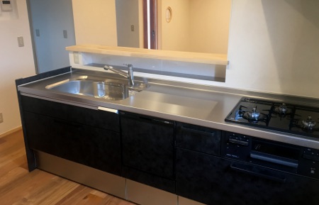 対面式キッチンは、カウンターの下に調味料置き場を作りました。 洗面台は、木製のカウンターに陶器を埋め込んだシンプルなデザイン。 2F子供室は、将来2つに区切れるように扉二つ分を確保しています。 現在は、1つの大きな「遊び部屋」です。