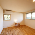 家の材料には合板を一切使用せず、内装は無垢材のフローリング、無垢材の天井板、板張り壁、そして珪藻土のみという、家に居ながらにして自然に囲まれたような気持になれる家である。