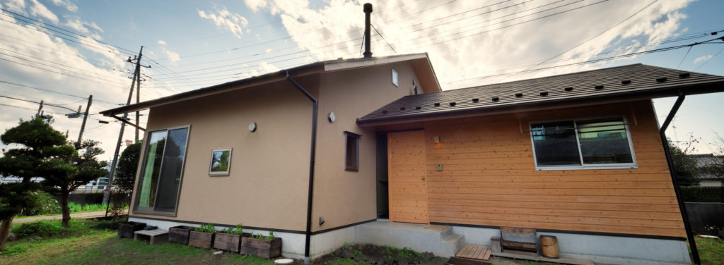 | 仕上材 | 外壁/そとん壁かき落とし仕上げ、杉板鎧張り 内壁/エコクイーン、タイル、サワラ羽目板 床/無垢フローリング(ナラ) 土間/モルタル金こて仕上げ 天井/エコクイーン、サワラ羽目板 軒裏/サワラ羽目板 ウッドデッキ/クマル 屋根/ガルバリウム鋼板 |