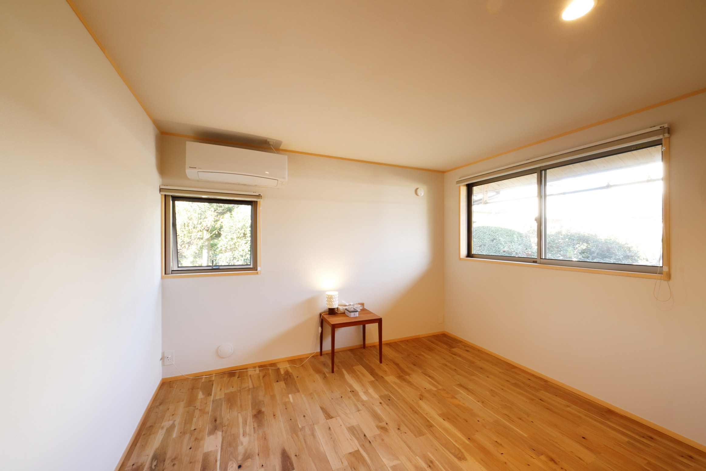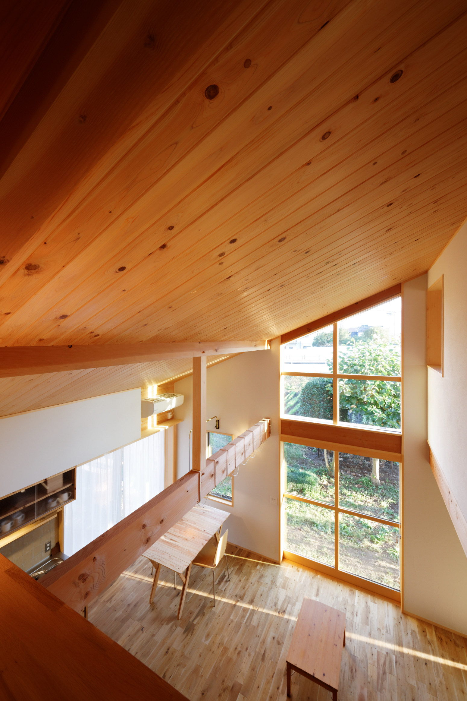 家の材料には合板を一切使用せず、内装は無垢材のフローリング、無垢材の天井板、板張り壁、そして珪藻土のみという、家に居ながらにして自然に囲まれたような気持になれる家である。