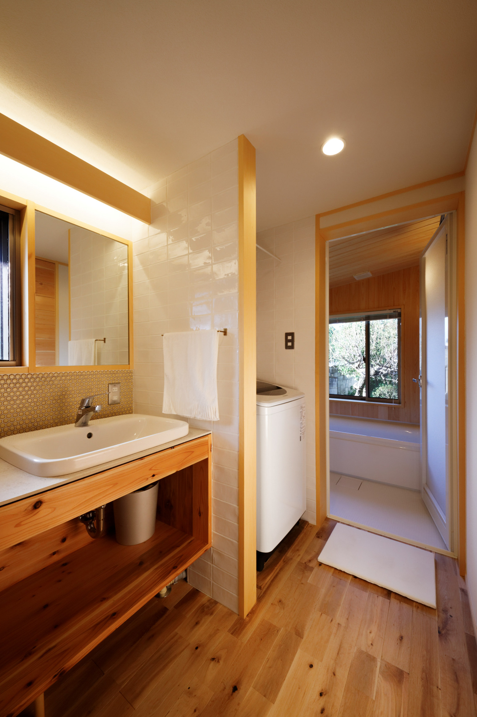 1階の階段脇や、2階の階段ホールには、デスクスペースが備えてあり、気分や季節に応じて様々な場所で、仕事や読書が可能である。キッチンはシンプルなI型の壁付けカウンターと、アイランドタイプの作業台の組み合わせとなっており、二人での調理に十分なスペースが確保されている。また、アイランドタイプの天板はパン生地をこねるのに適した大判タイルとしている。浴室は、ハーフユニットバスを採用し、防水性やメンテナンス性を確保しつつ、壁と天井をヒノキ張りとすることで、木の香りに包まれたくつろぎの空間となっている。