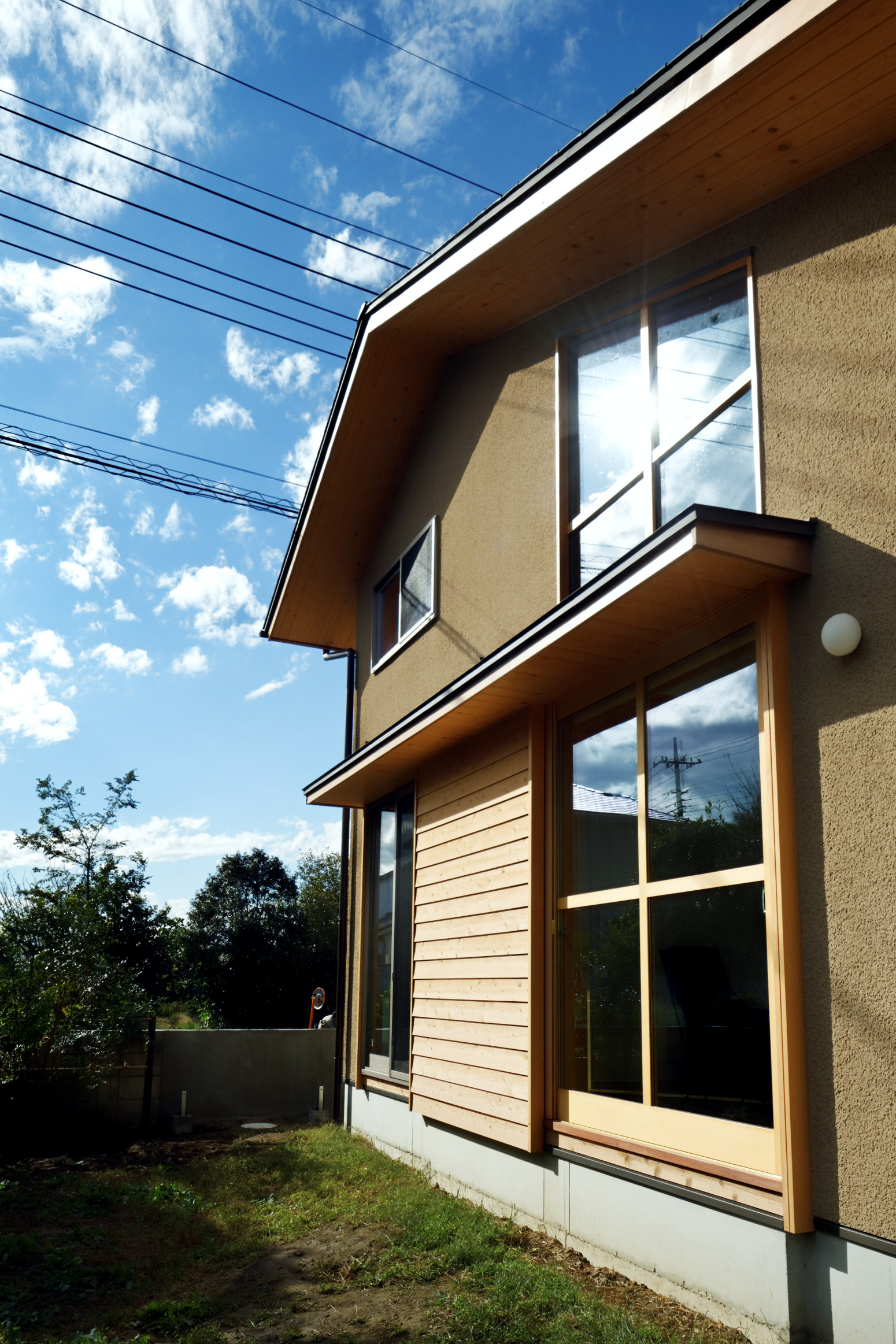 外壁は、二階建て部分は、火山灰が主原料のそとん壁。平屋部分は杉板よろい張りとなっている。間取りは、一階にLDKと客間(和室)、主寝室。二階に、必要に応じて2分割も可能な広めの子供部屋という配置である。