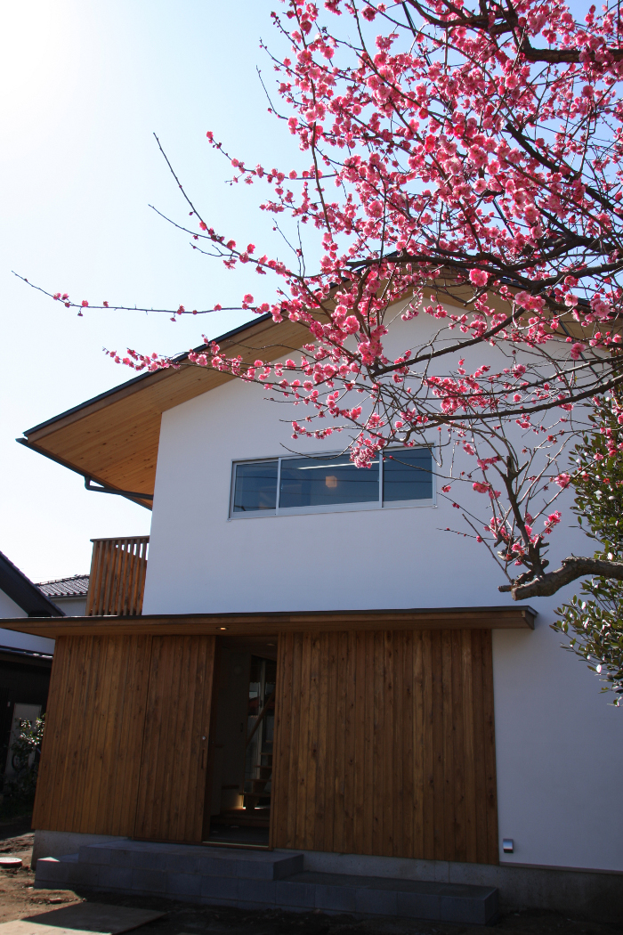 梅の花と白壁と木の家