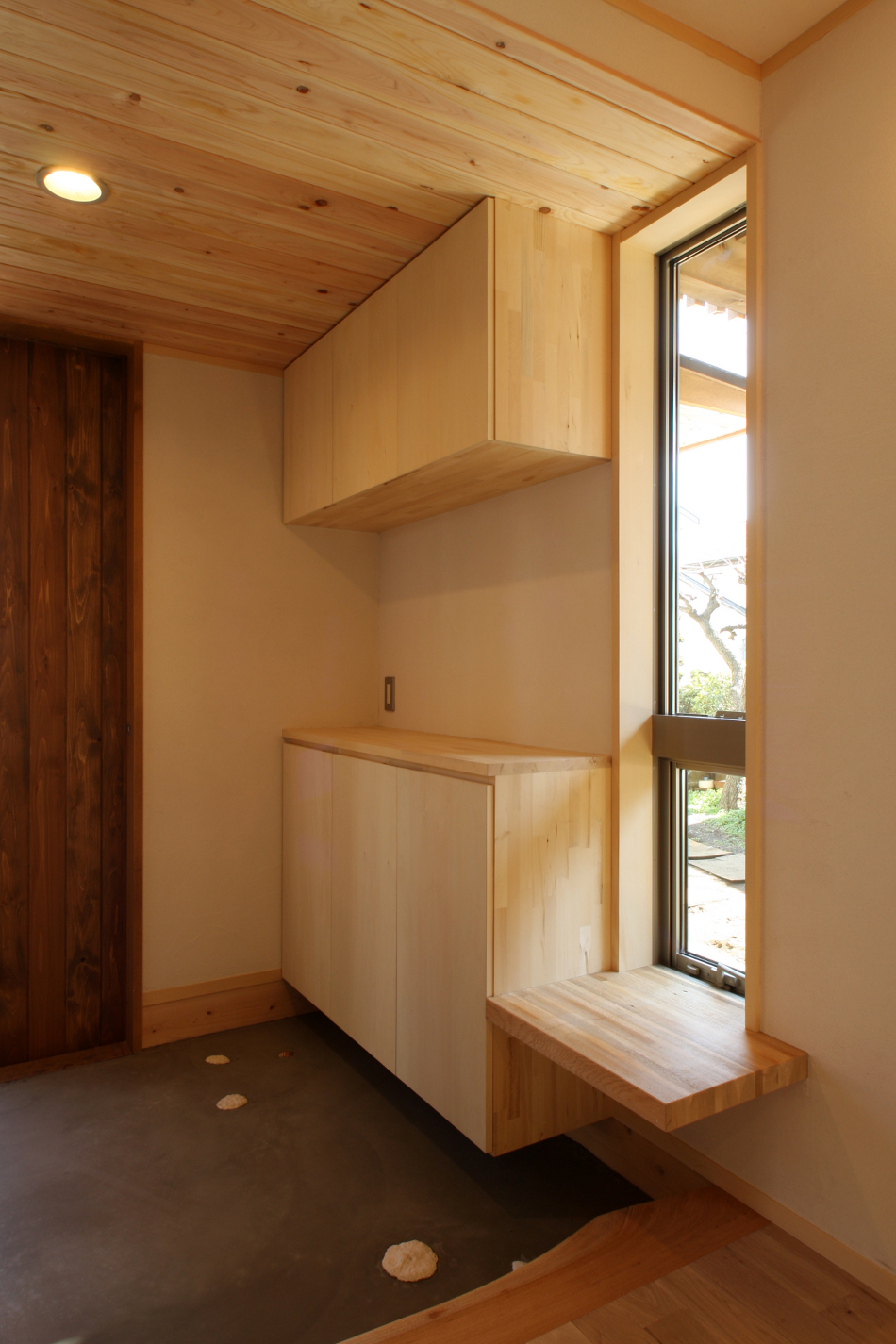 暗くなりがちな玄関に縦長の窓で明るく