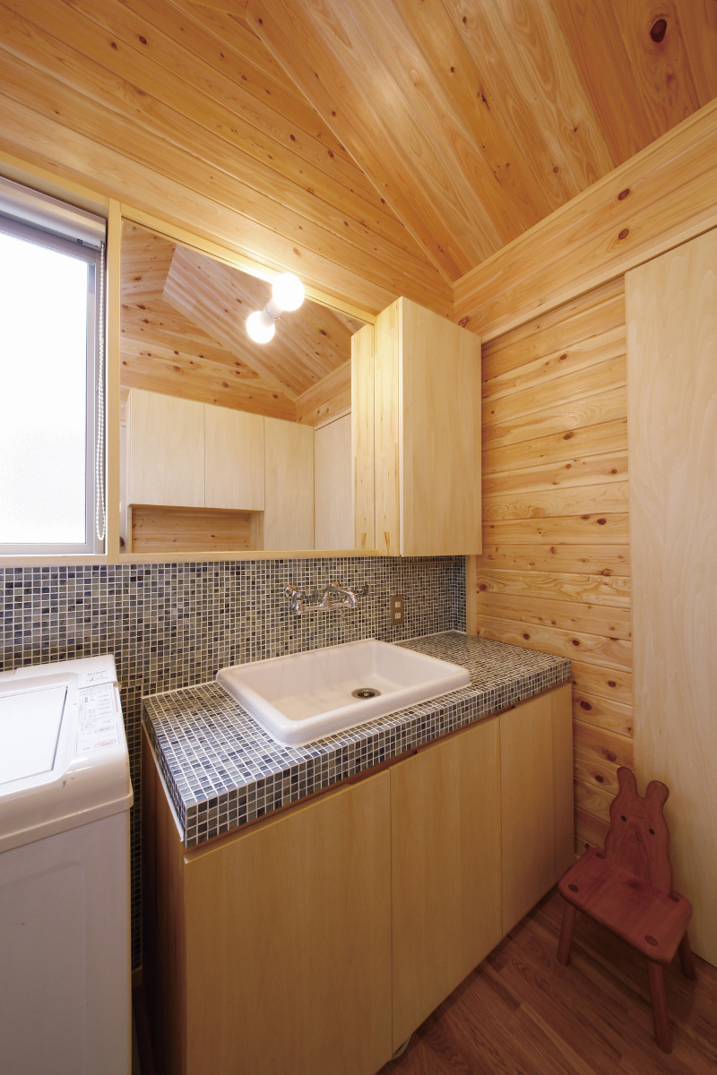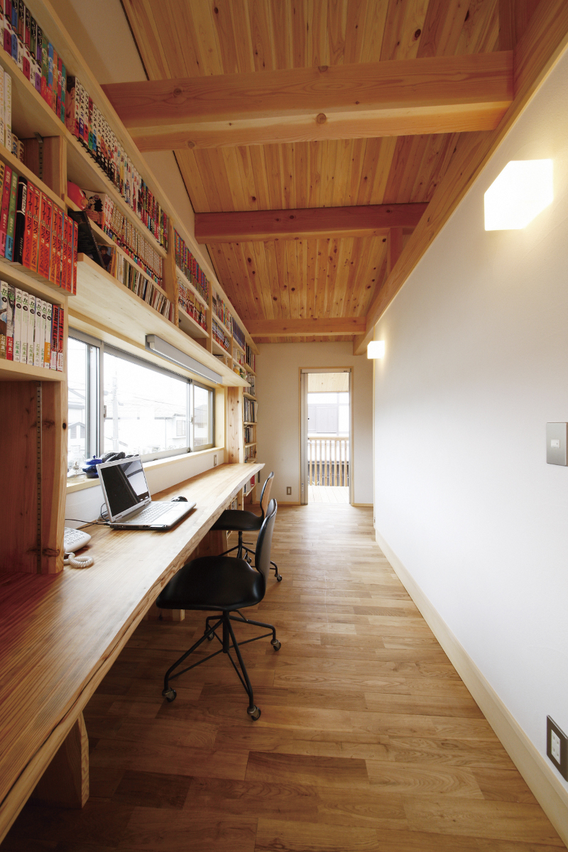 2階の天井は、外部の軒裏から続くサワラの板張りで、大きな屋根に抱かれた安心感と無垢材の温か味にあふれた天井である。内部の壁は、調湿性に優れた珪藻土であり、適度に残ったコテ跡が壁に様々な表情を作り出している。