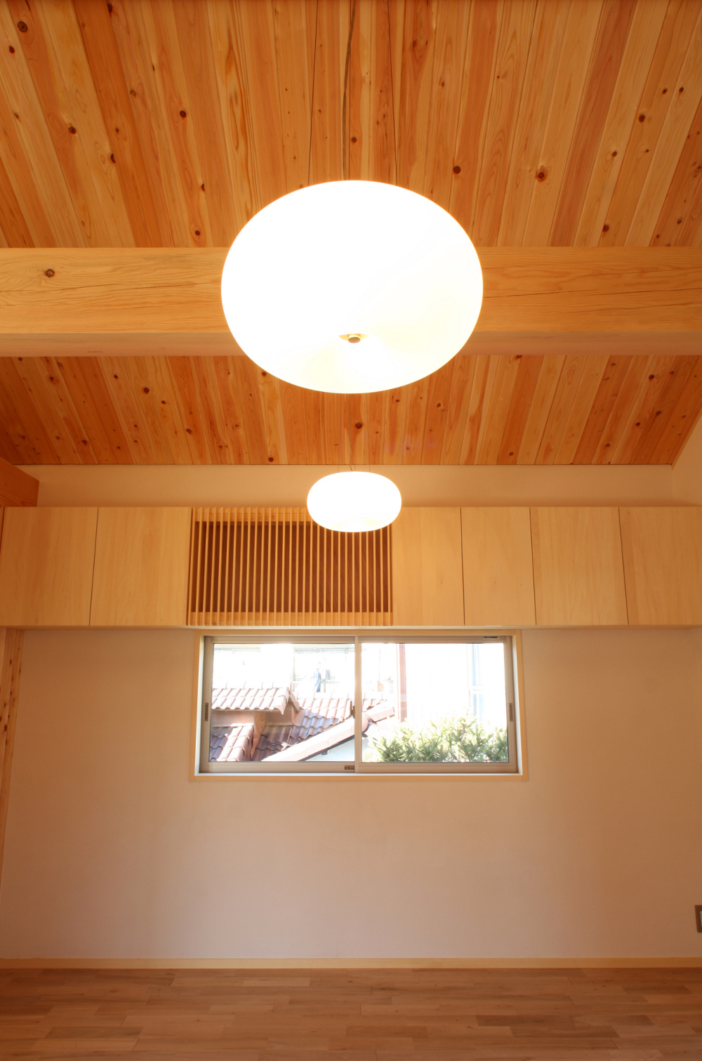 2階リビングはサワラの勾配天井が連続するデザイン