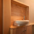 無垢フローリングの浴室部には一枚板の洗面台