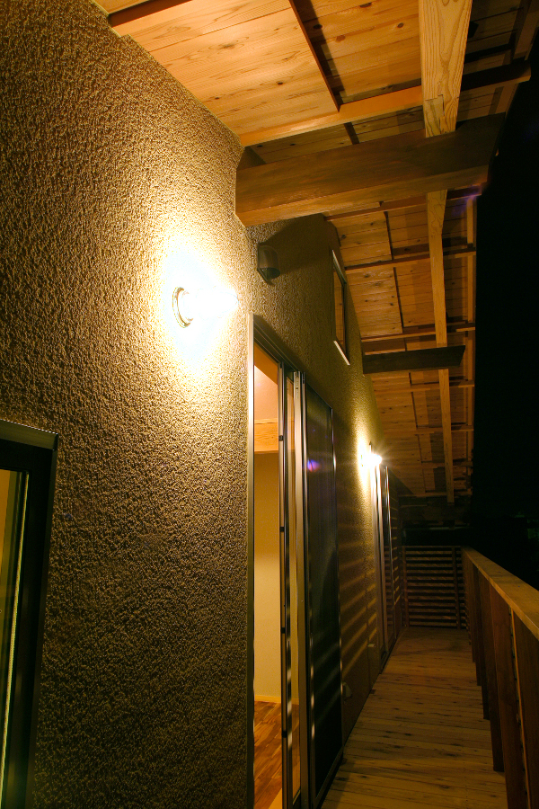ベランダのライトアップで軒裏が照らし出される