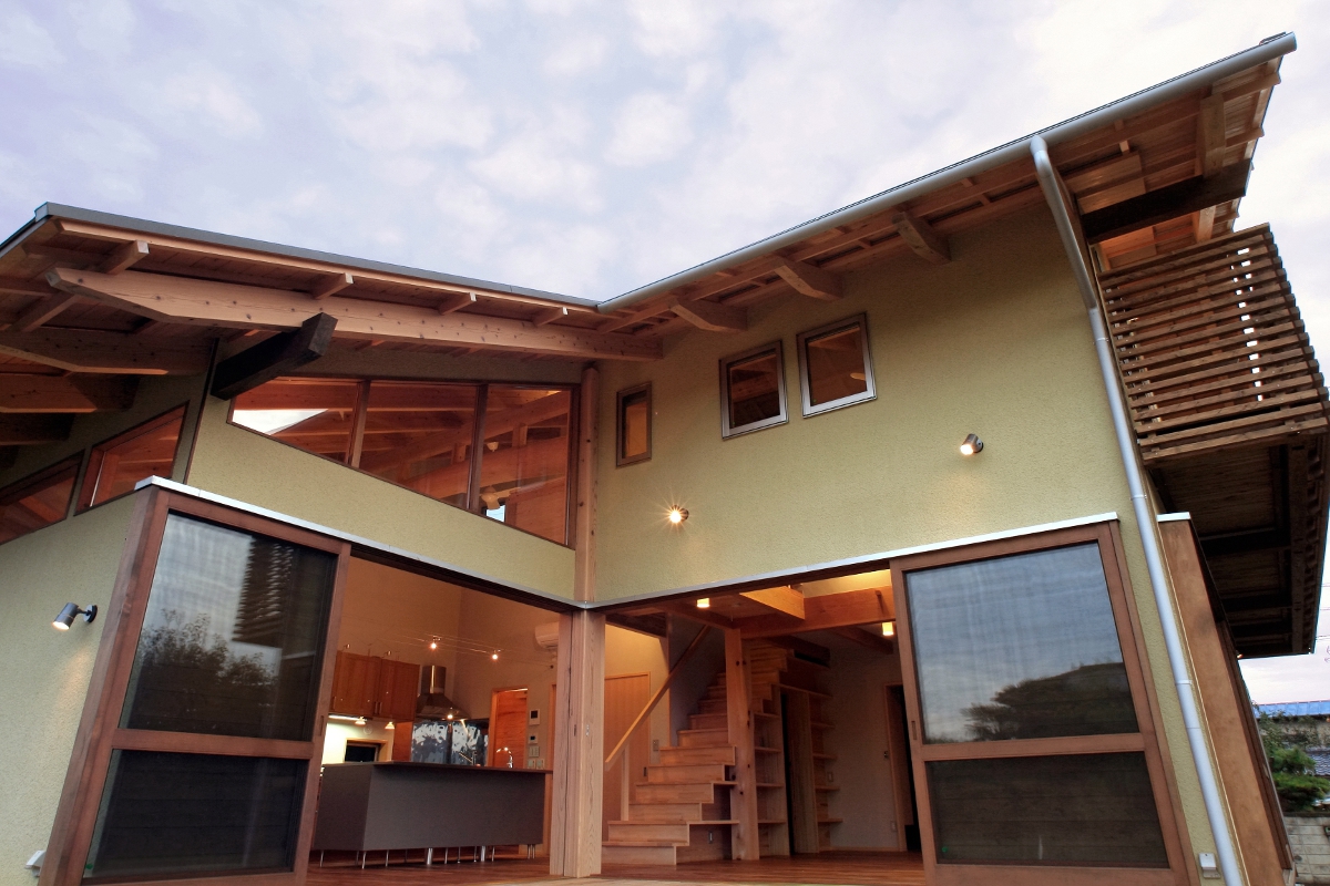 大きな屋根と深い軒が特徴のこの家は、「夏涼しい家がほしい」という要望のもと、家族3人の為に建てられた。南面には大きな木製建具を配置し風を取り込む。取り込んだ風は、室内を通り北面の高窓より抜けていく。こうした風の流れを設計に取り込む事で「夏涼しい家」を実践している。