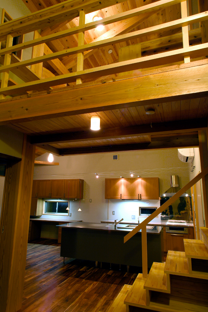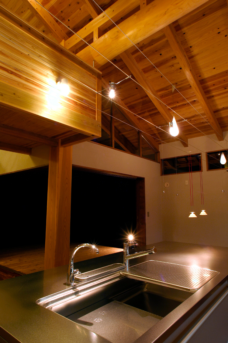 キッチンの位置そのものはリビングとダイニングの中間にあって、家の中心。大きな吹き抜け部に浮かぶ書斎スペースとの距離も近く、家族全員が常にお互いの存在をどことなく意識できる、そんな距離感を大切にしたプランニングとなっている。