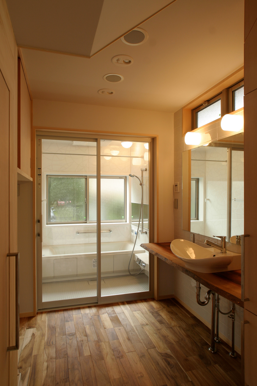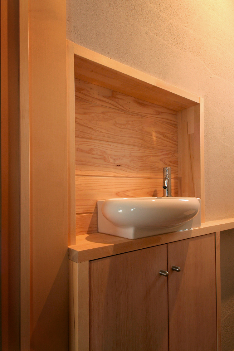 無垢フローリングの浴室部には一枚板の洗面台