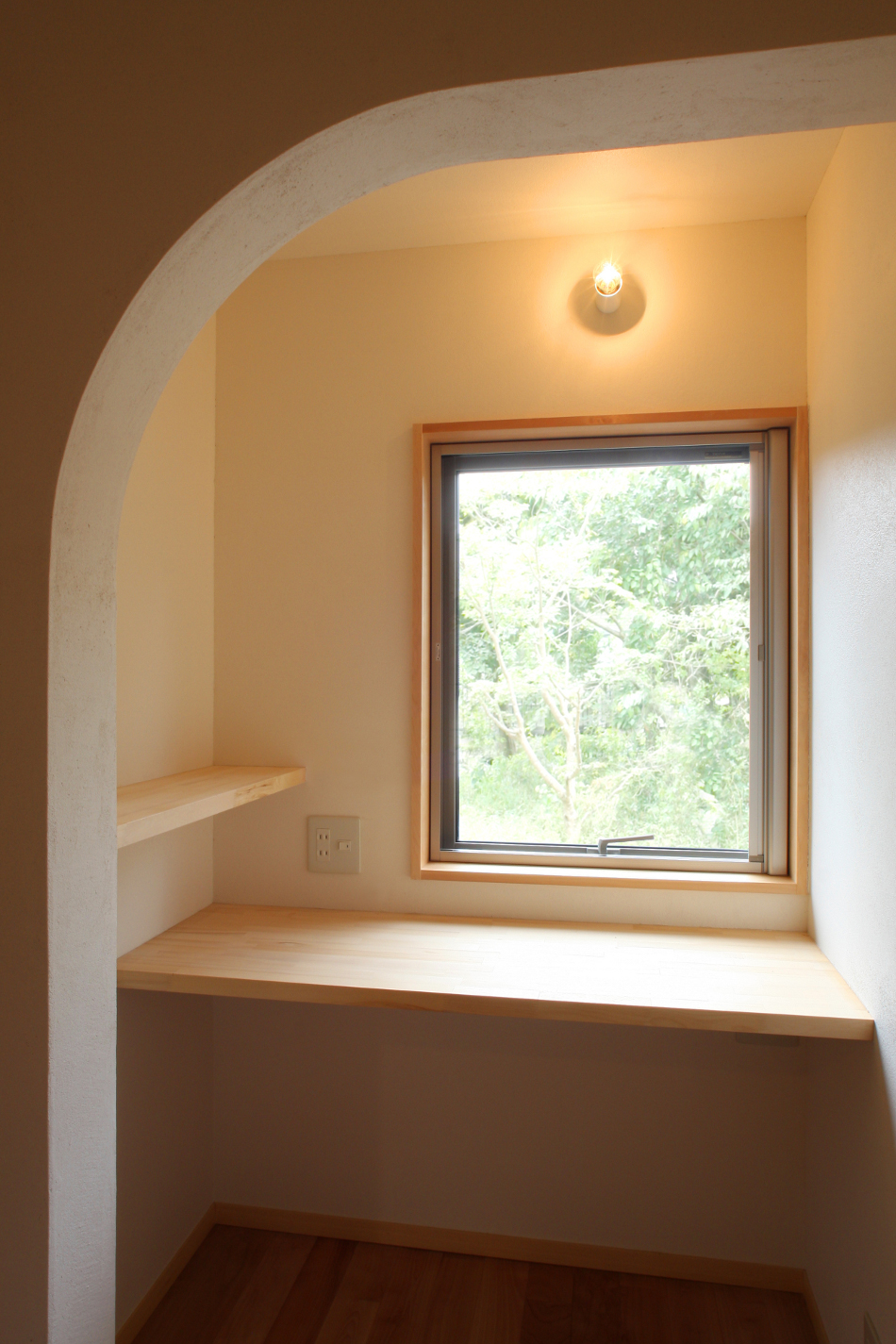 これらの要素は外部から内部まで、貫通して同じ仕上げが施されており、室内にいてもそのゾーンニングを充分意識する事が出来る。(2)のチンキング部分は少しヨーロッパのテイストが意識されている。ワインセラーを思わせるアーチ型の廊下やそこに配置された証明器具は、この別荘を訪れる人を一気に非日常の空間へと引きずり込む工夫の一つ。(1)のLDKは6mの天井高を持つ大きな空間。高い天井と大きな開口部がこの空間にゆったりとした時間の流れを与えている。