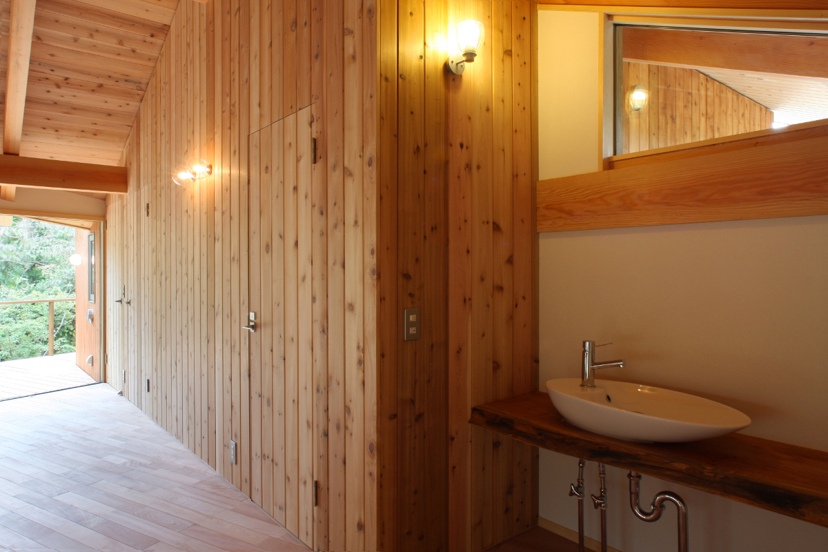 設計のコンセプトは非日常を満喫できる山荘。山の中でゆっくりと流れる時間を実感できる空間にするために様々な工夫が施されている。