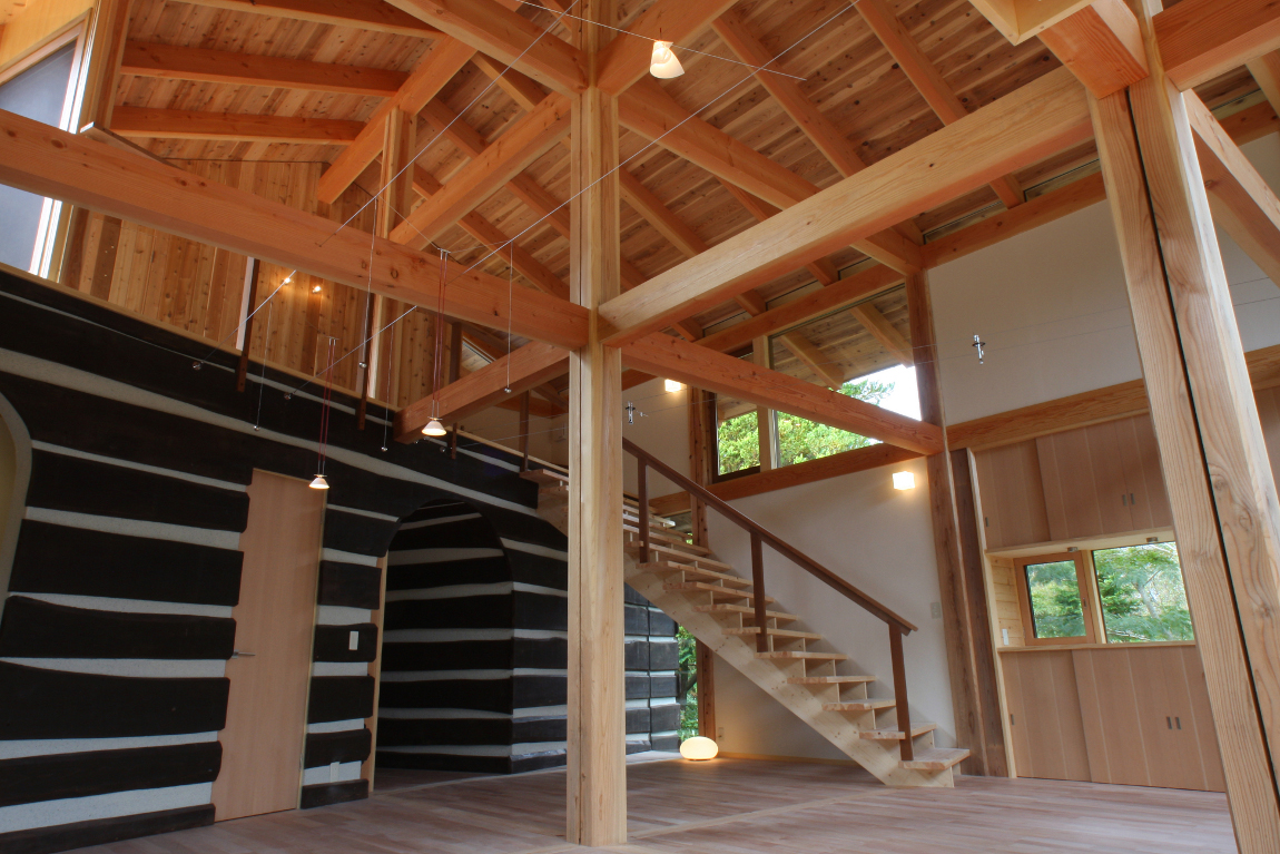 40畳分の大空間をささえるダイナミックな木組みと大屋根。