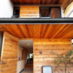 敷地東側と南側が緑の多い開放的な環境のため、木製建具の大きな開口で開き、ウッドデッキを設けてリビングから外部までを緩やかに繋げた。このデッキはアプローチの大谷石の敷石へと繋がり、家のまわりをぐるりと回遊できるプランである。外壁の一部に米杉の鎧張り部分を設け、玄関扉も同じ鎧張り仕上げとし、玄関まわりの壁と扉が美しく連続するデザインとなっている。