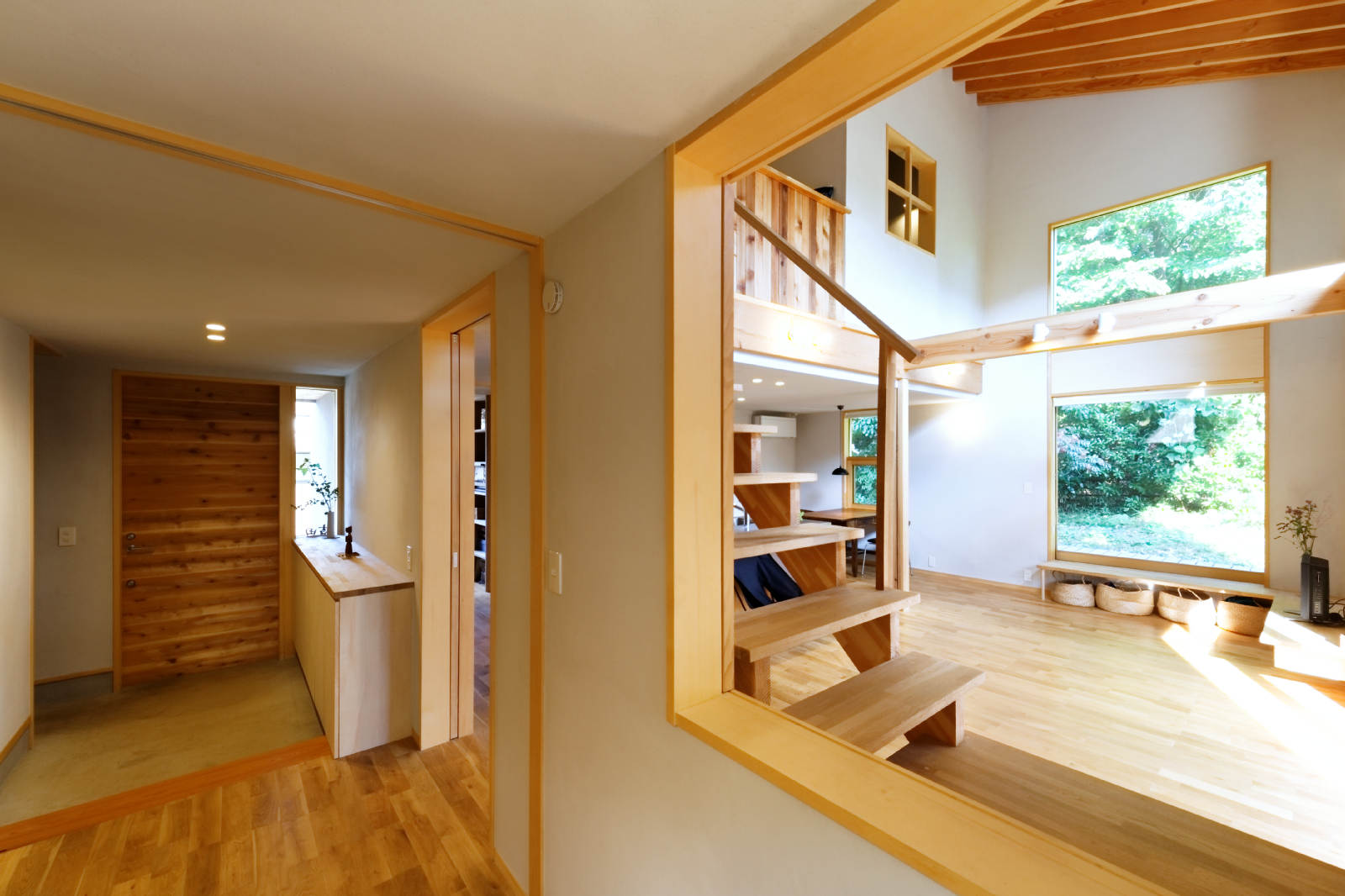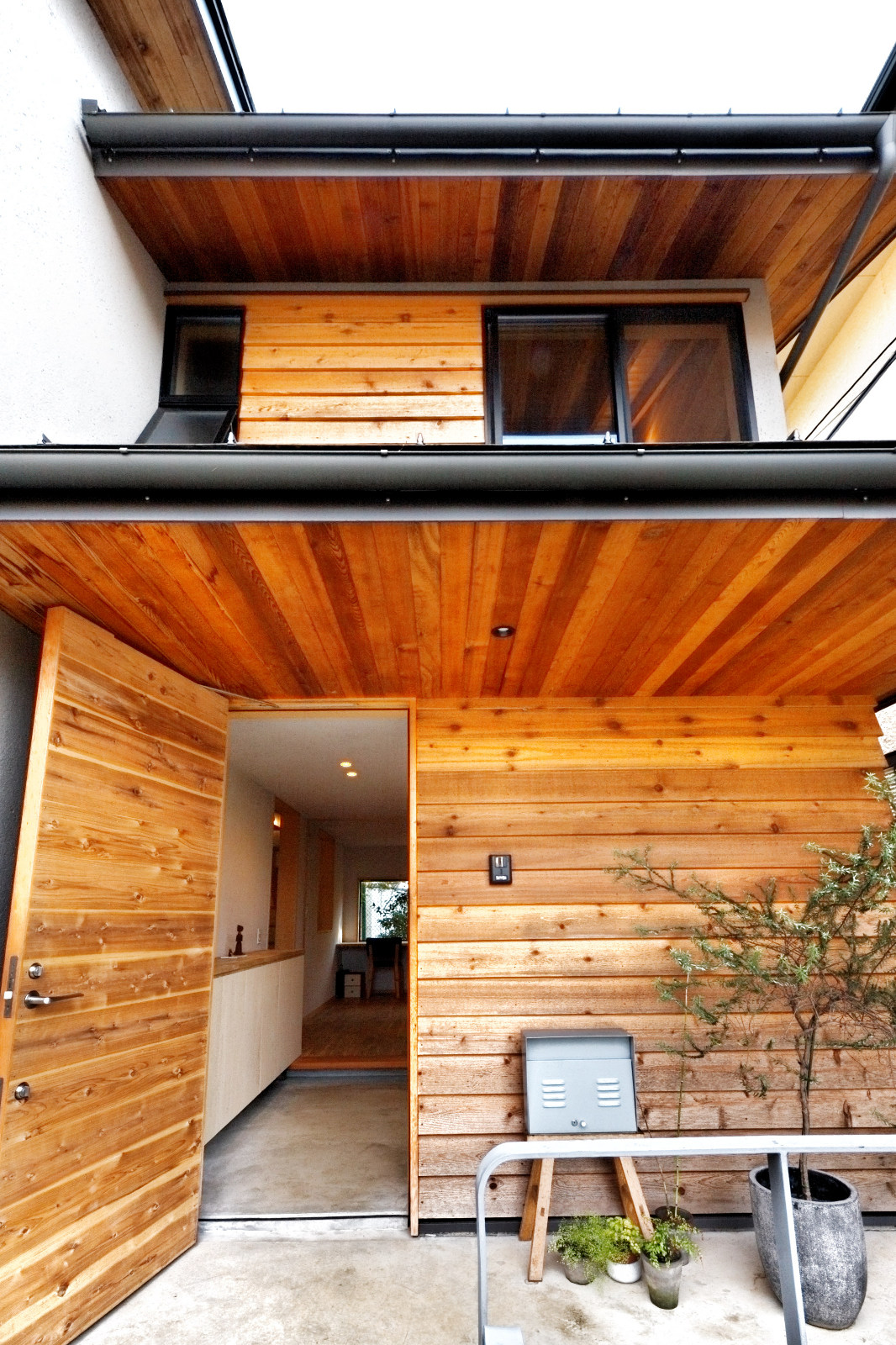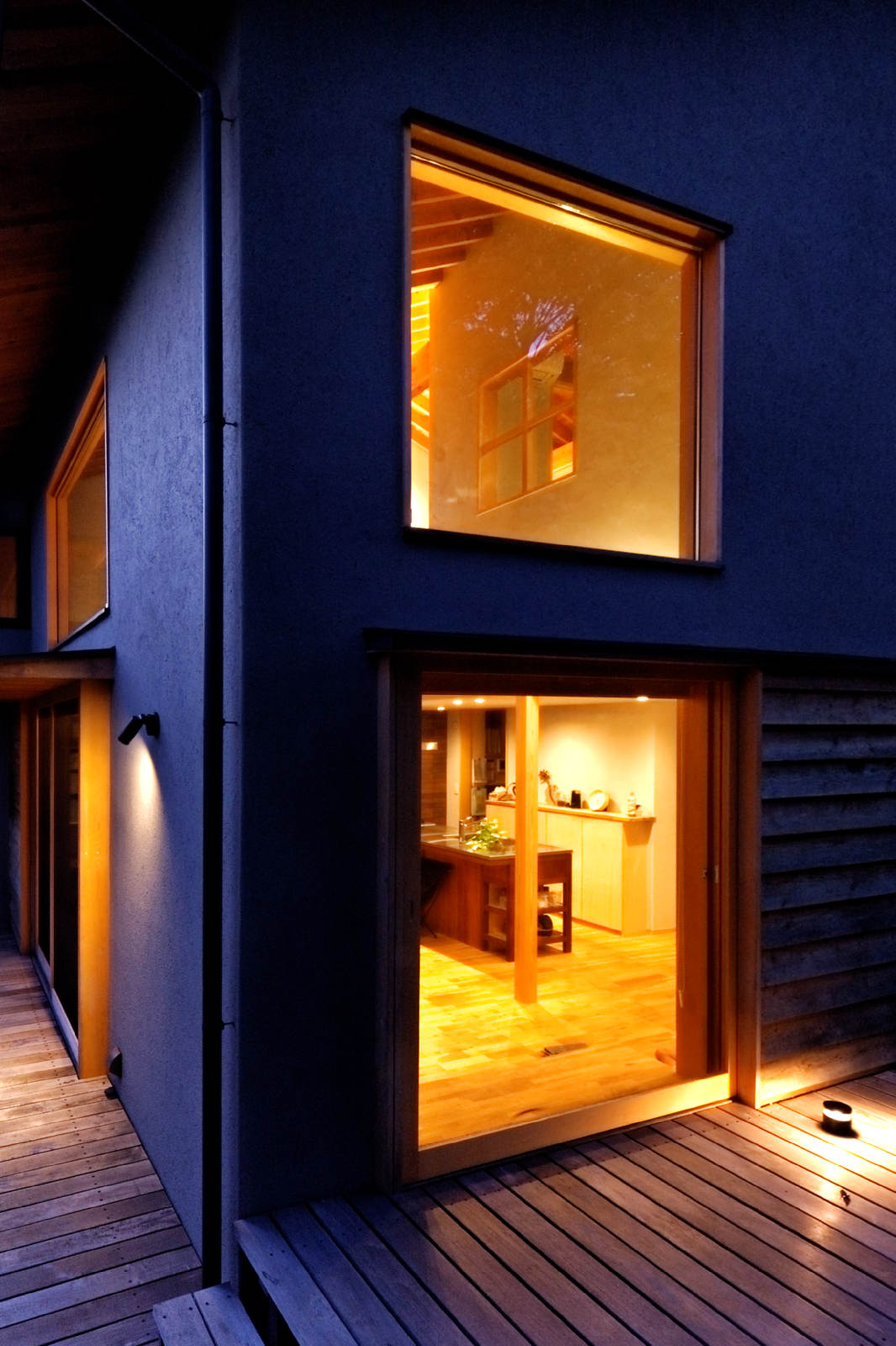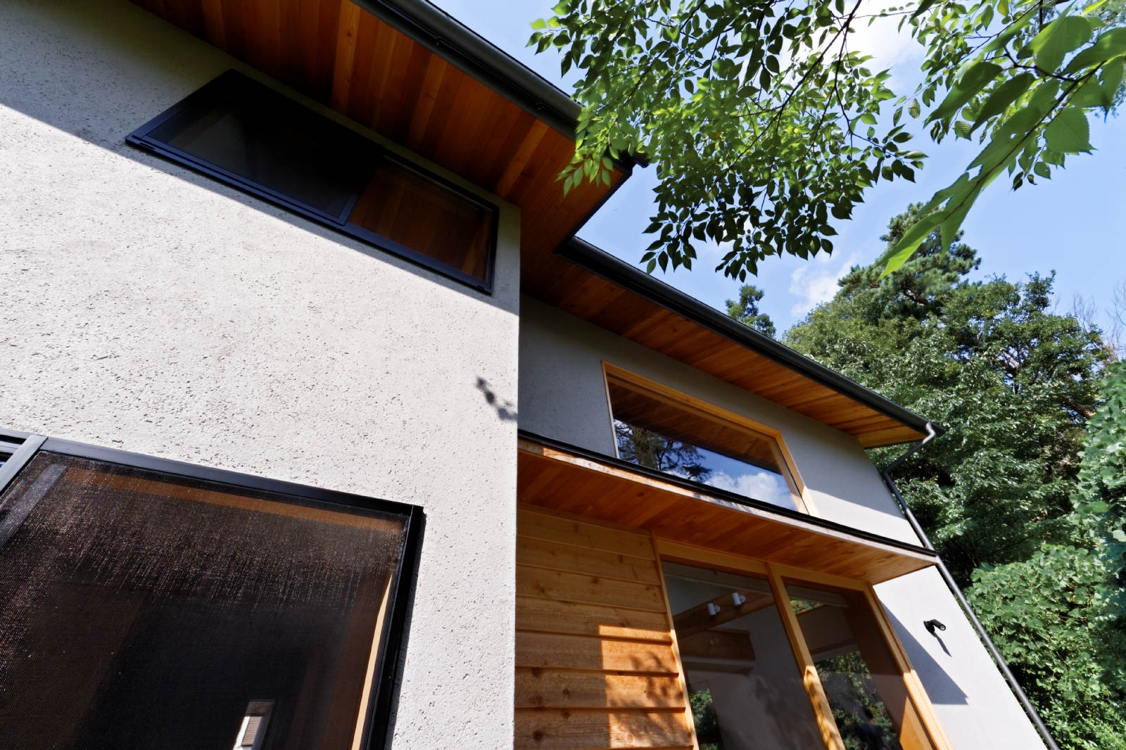敷地東側と南側が緑の多い開放的な環境のため、木製建具の大きな開口で開き、ウッドデッキを設けてリビングから外部までを緩やかに繋げた。このデッキはアプローチの大谷石の敷石へと繋がり、家のまわりをぐるりと回遊できるプランである。外壁の一部に米杉の鎧張り部分を設け、玄関扉も同じ鎧張り仕上げとし、玄関まわりの壁と扉が美しく連続するデザインとなっている。