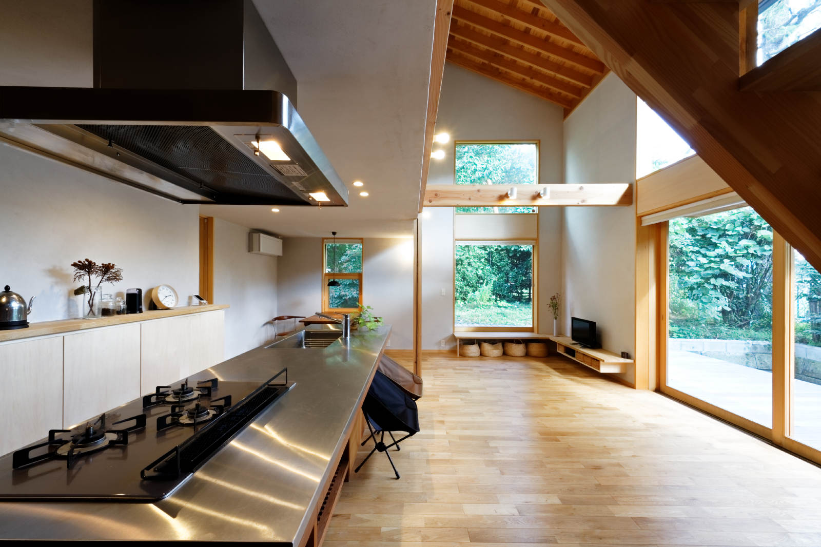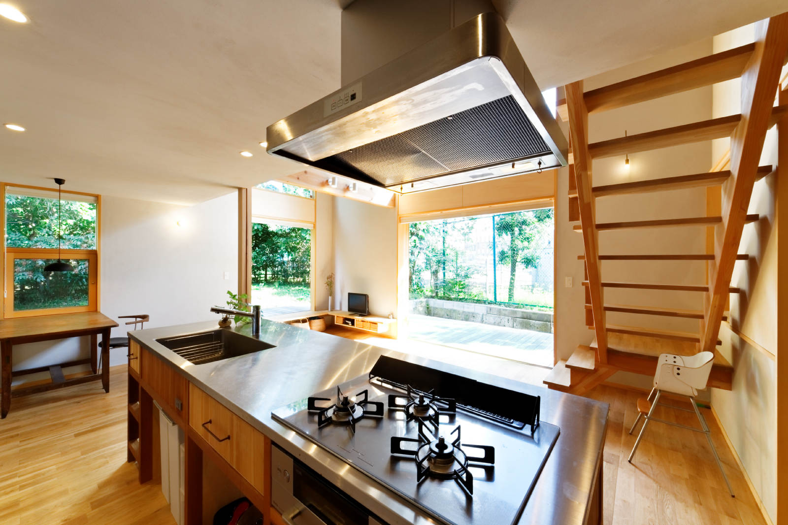1階には開放感溢れる18.6畳のLDK、書斎、水回り。2階には個室2部屋とインナーテラス、階段上にフリースペースを配置。キッチンは大工さんによる造作で、フレームを40×60ミリの米杉材で組み、その上にステンレス天板のワークトップを載せたつくりとしている。