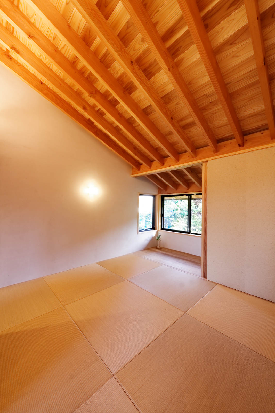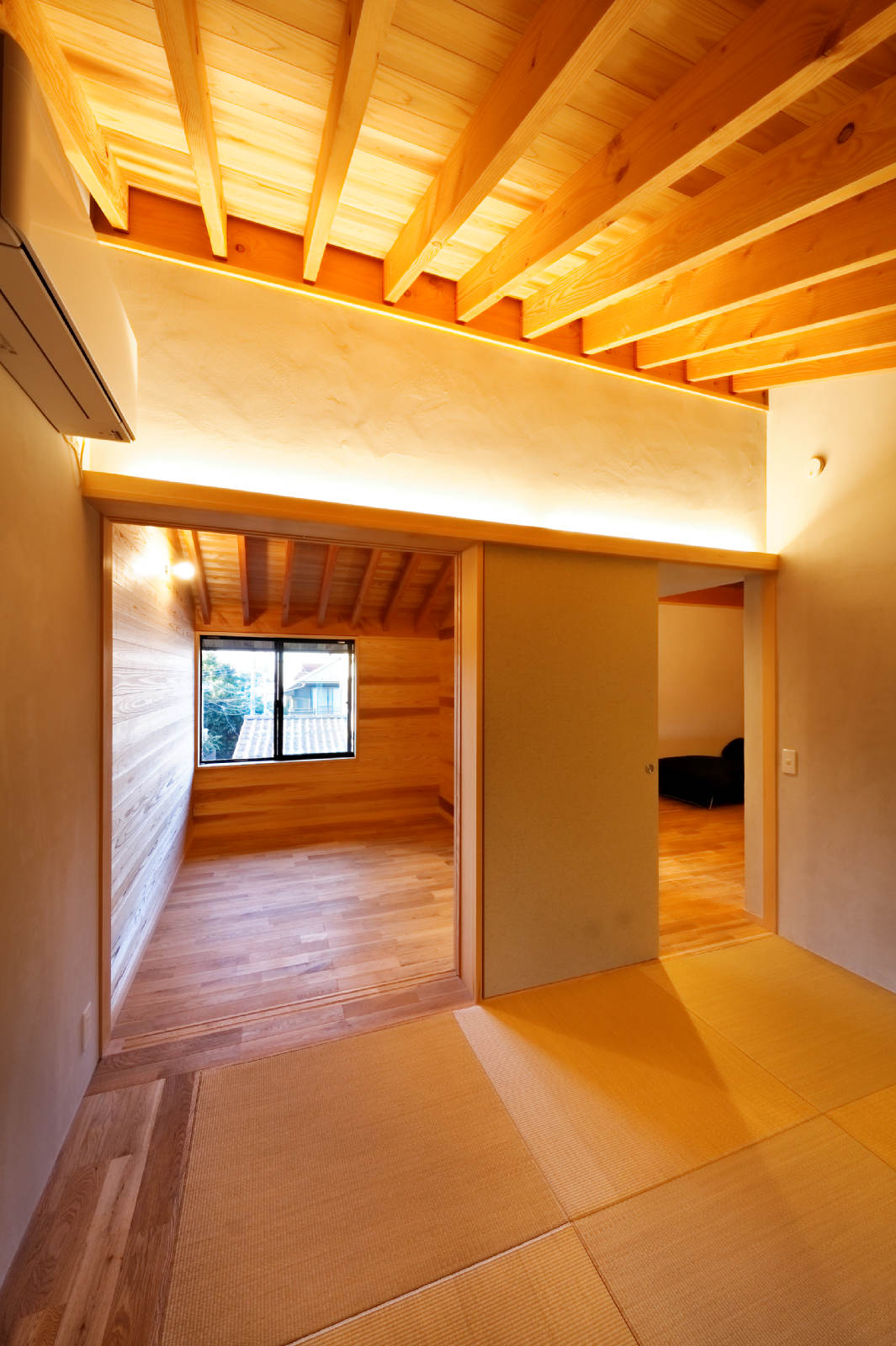 各々の部屋は個室として独立しているが、引き戸やガラス、梁上の抜けなどによって、 空間として区切られつつも意識的な繋がりが感じられるよう工夫した。その中で化粧垂木が連続する天井面は、意識と意匠の繋がりを象徴するアクセントとなっている。